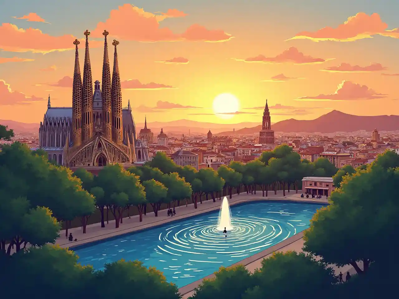 Een zonsondergang van Barcelona - illustratie met de kerk van de Sagrada Familia, Casa Batlló, de magische fontein, Recinte Modernista de Sant Pau, Park Güell, kathedraal van Barcelona