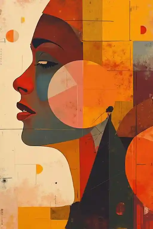 2D, schilderachtig, Bauhaus stijl, elegante eenvoud en functionaliteit, gebroken vrouwelijke geometrische vormen, heldere, gedurfde lijnen, rijke kleuren, geometrie, geometrie