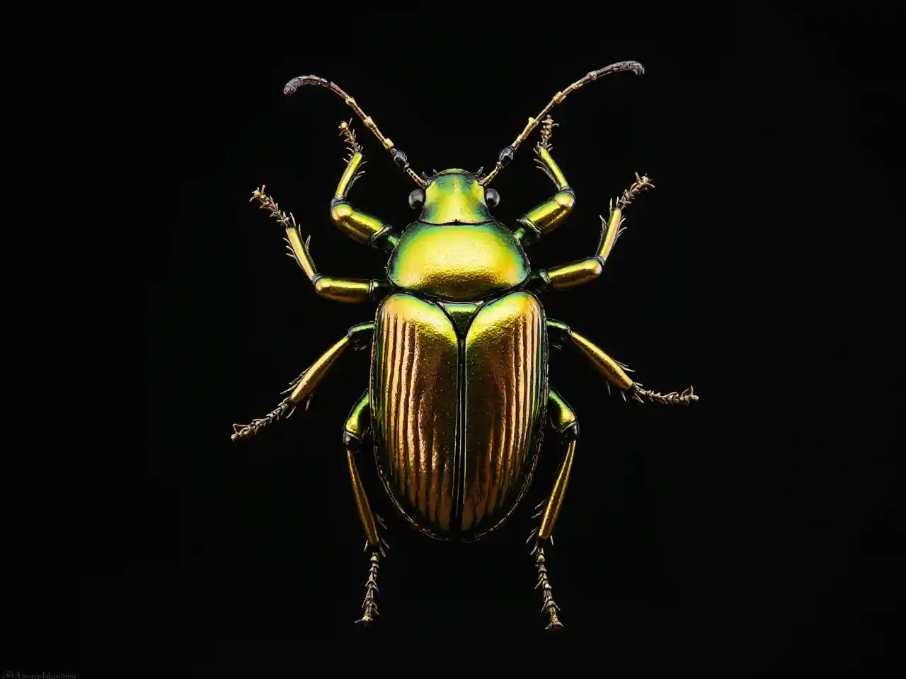 laaaaraEen prachtige kever, metaal, goud en kalkgroen, zwarte achtergrond, ongelooflijk gedetailleerd, overhead view, levendige, dramatische verlichting