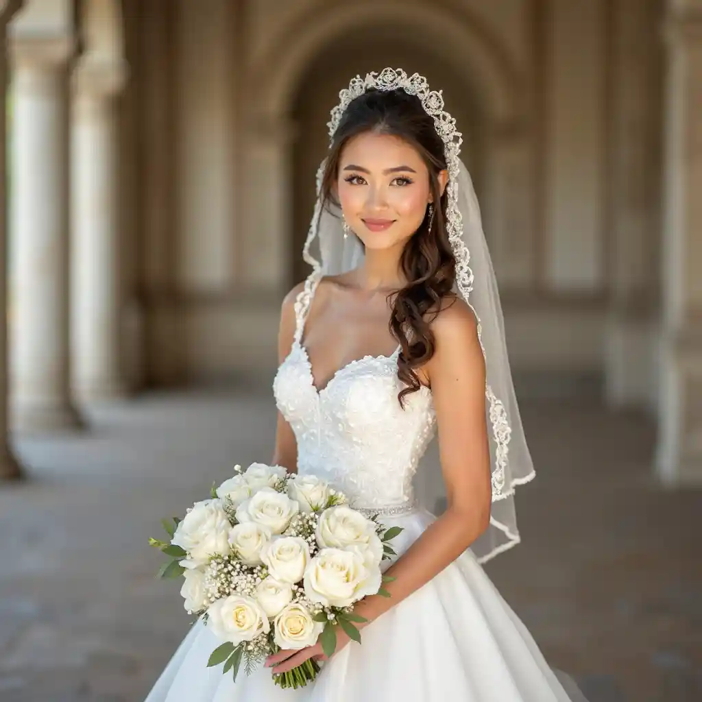 Verbazingwekkend mooie jonge vrouwen ze is de wereld mooie vrouwen in de wereld dat veel ze is mooi ze draagt een prachtige witte bruidsjurk en bruidsboog ze ziet er zo mooi en ze houdt een bloemboek in haar handen ze deed prachtige make-up ze ziet er zo prachtig en ze staat in een prachtige bruidszaal