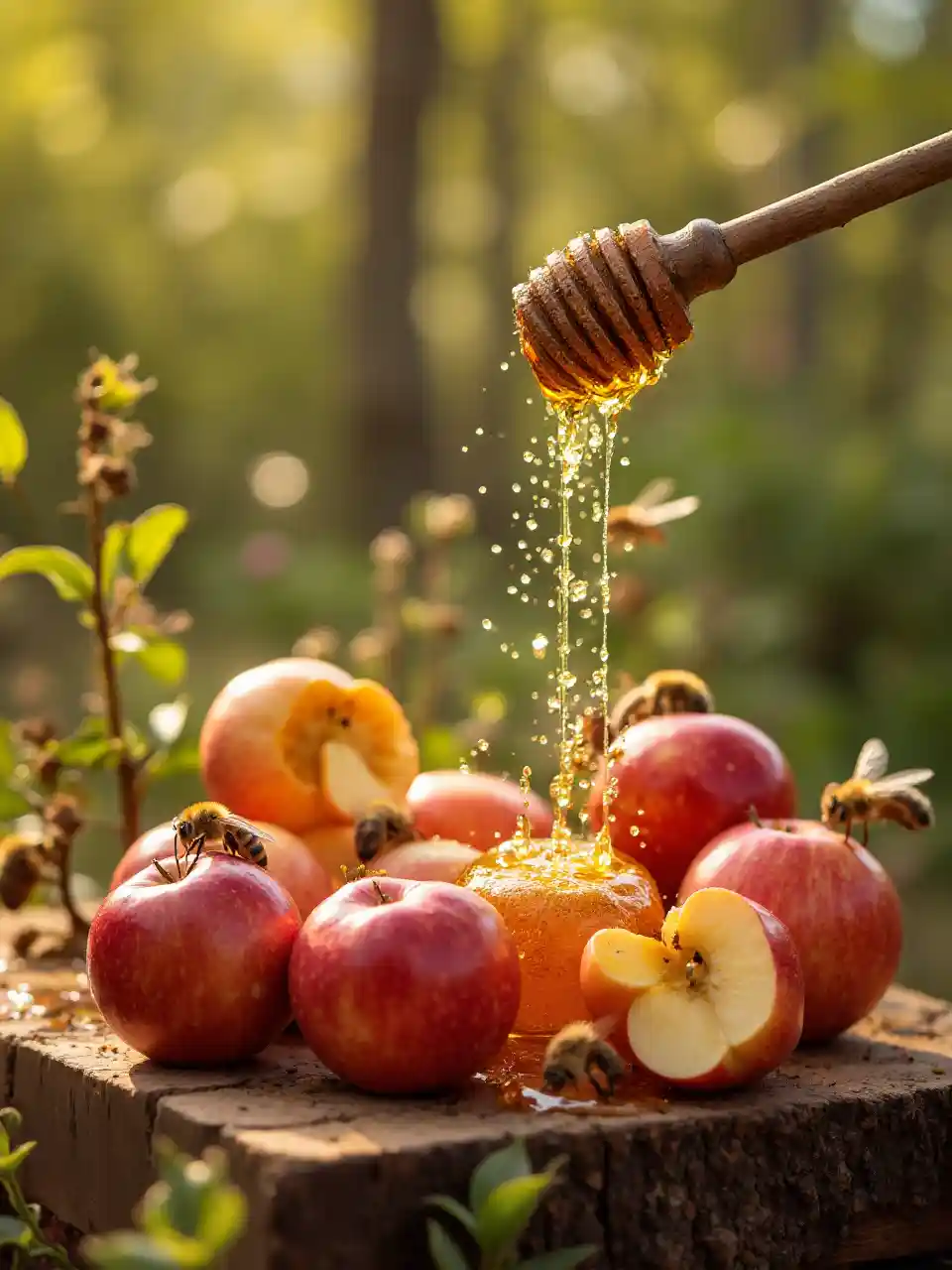 EmmaBijenkorf vol bijen, honing, gesneden rode appels met honing gedoucht