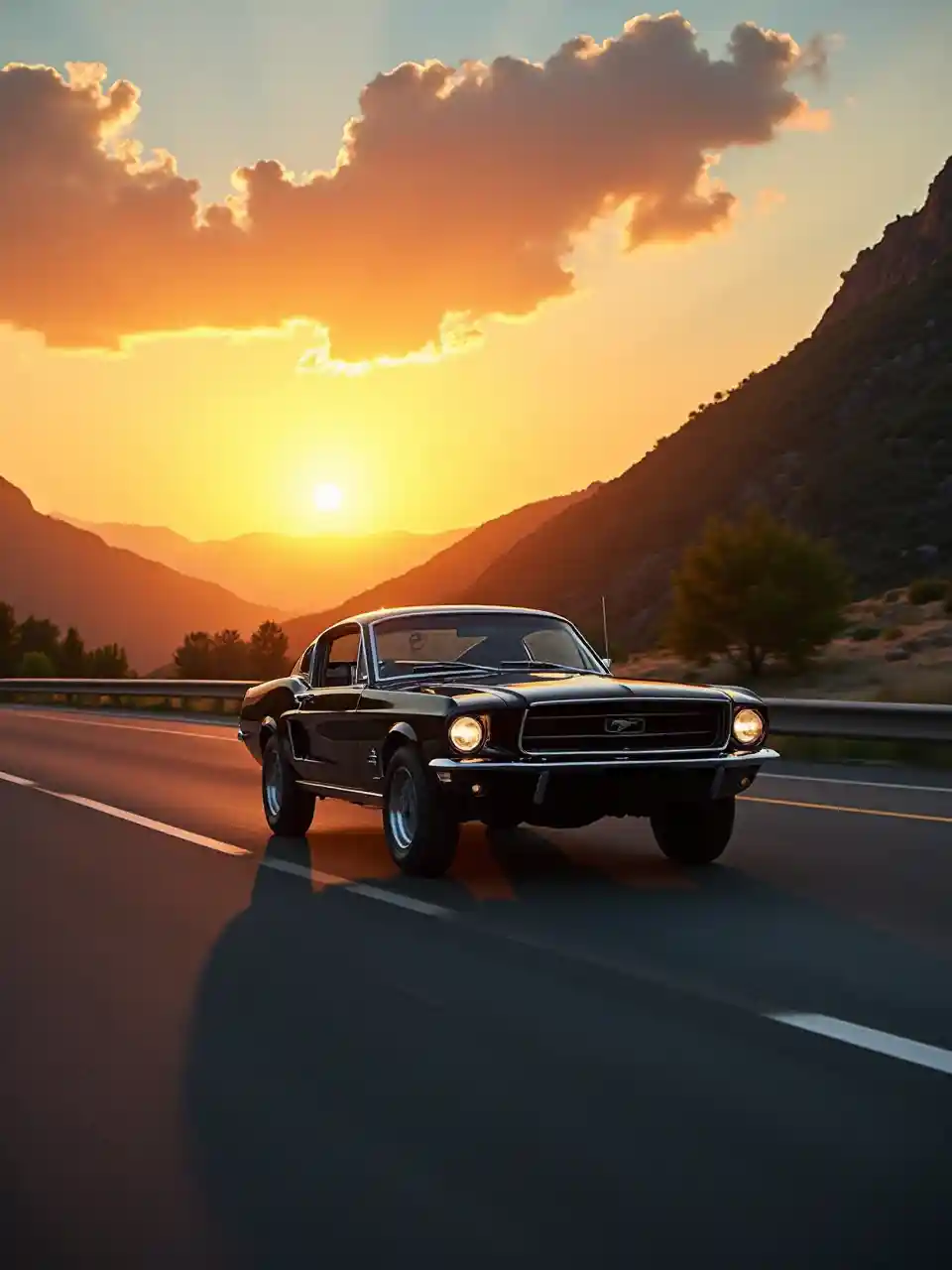 1968 zwarte Ford Mustang op de snelweg, versnellen naar de zon, zonsondergang, bergen op de achtergrond