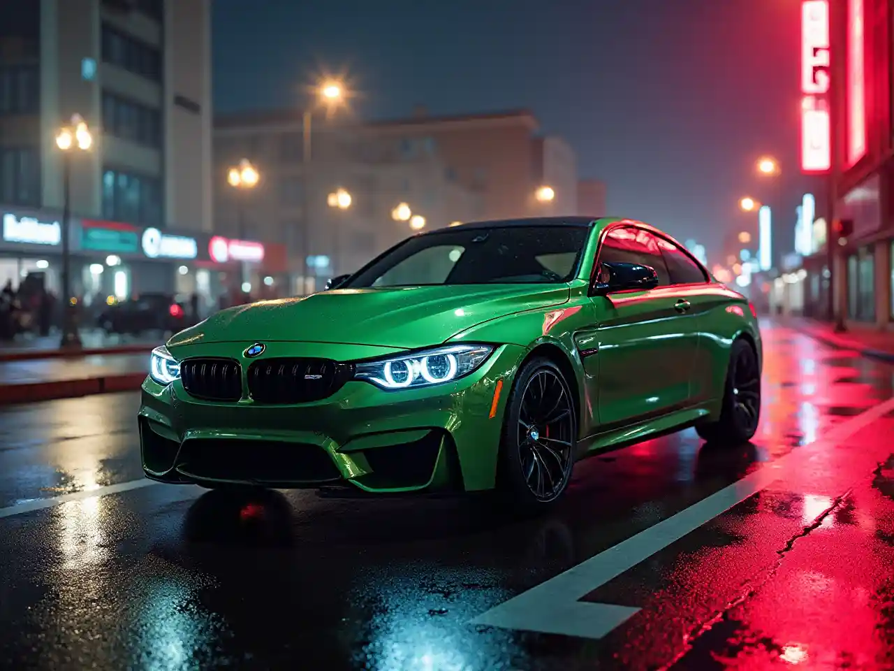 EthanBmw m4 maat green colour with golden rim. In neon city with red neon lights.