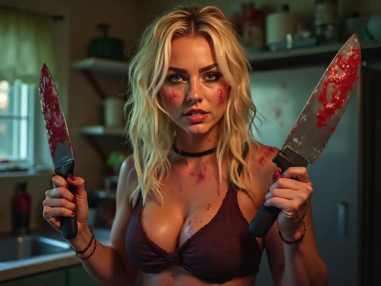 Britney Spears in de keuken met twee grote slagersmessen, vuile make-up en rommelig haar, Halloween kostuum, levendige verzadigde kleuren, zeer gedetailleerd, contrast kleuren