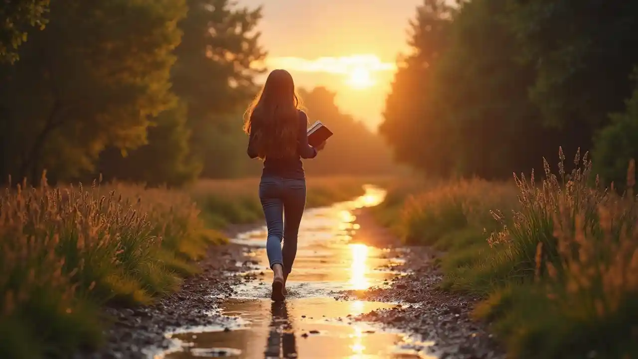 EthanEen mooie lange brunette die door plassen loopt. Ze leest ook een boek. De zon begint te schijnen tussen de wolken.