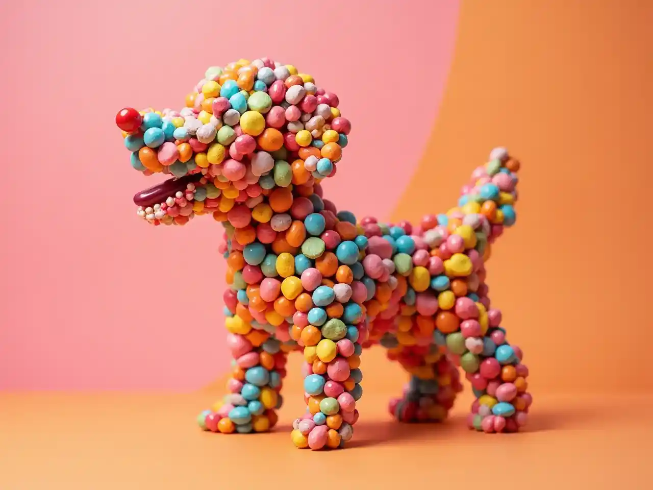 Een speelse hond gemaakt van verschillende kleurrijke snoepjes tegen een roze en oranje achtergrond.