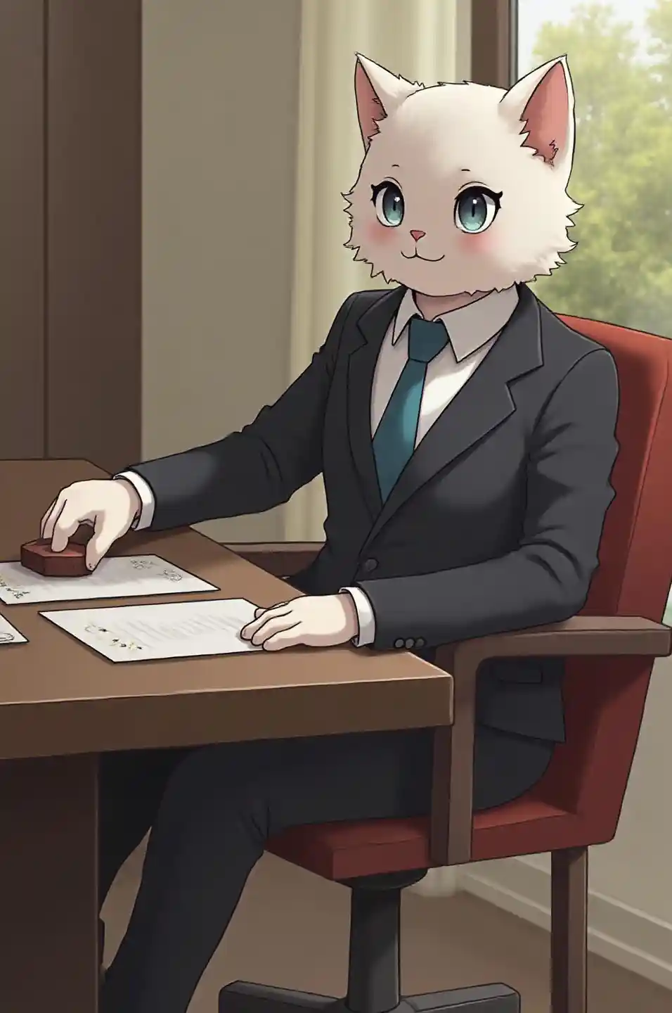 Dit is een wereld waar geen mensen en alleen katten zijn, en er zijn katten die in pakken werken, op een stoel zitten en papieren op het bureau stempelen met poten