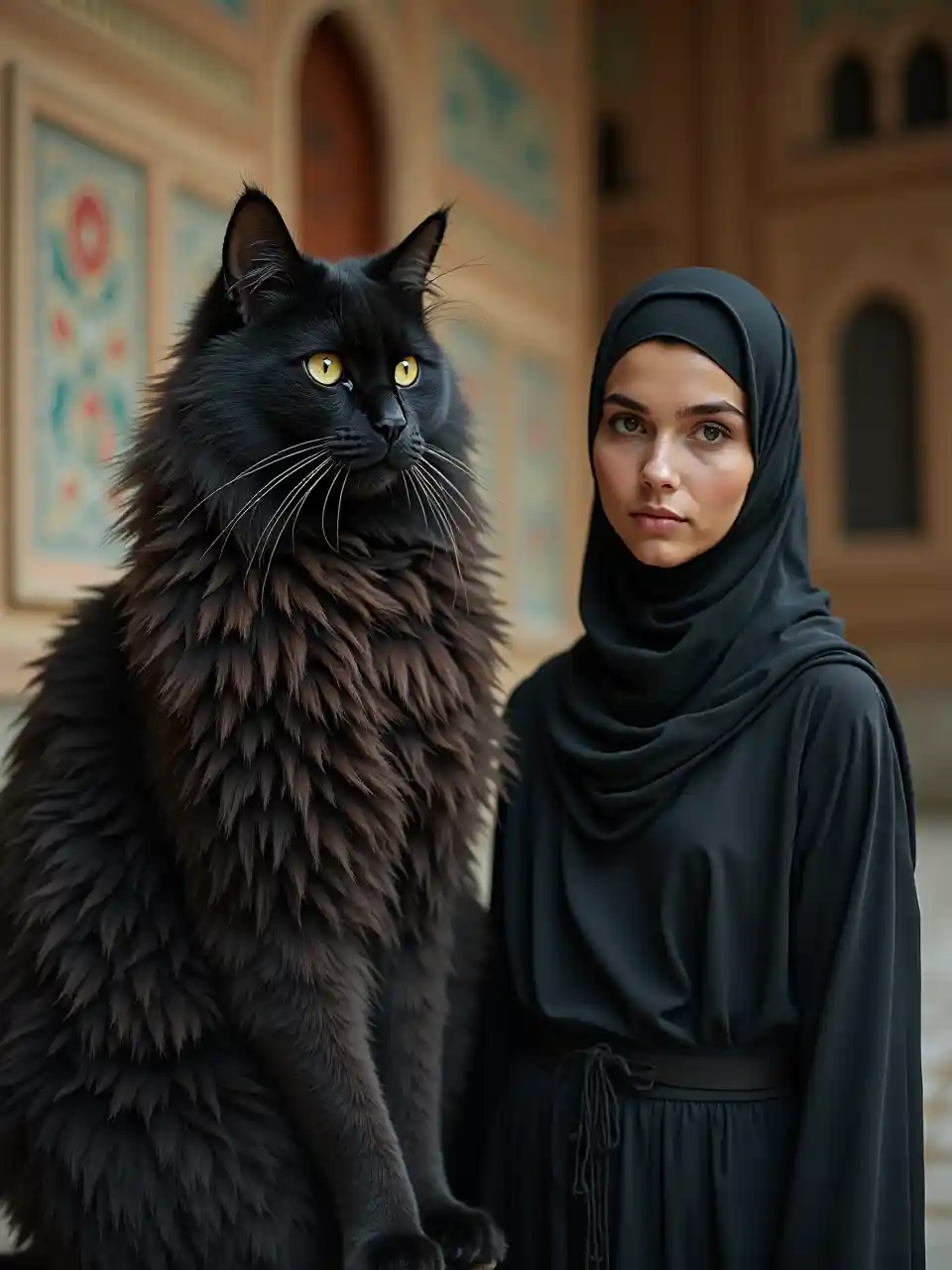 hyper-realistische, ultra-detailleerde foto van een grote maincoon kat die zwart gecoat arabic mode draagt en een mooie vrouw die hijab niqab arabic mode draagt in de renaissance Ottomaanse moskee achtergrond, scherpte