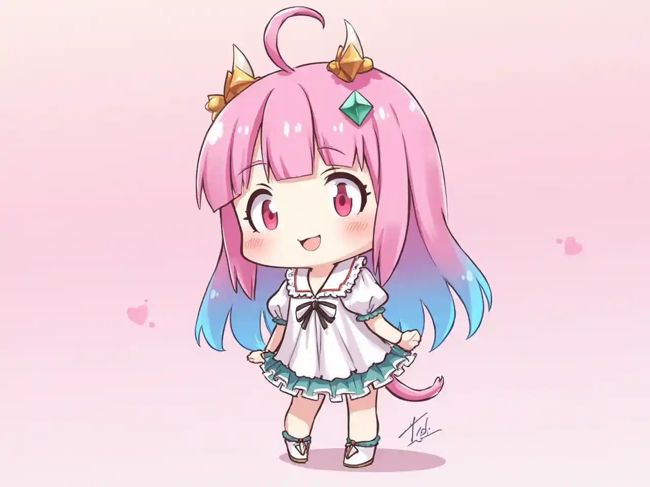 Meesterwerk, beste kwaliteit, 8k, filmisch licht, ultra hoge resolutie, chibi, 1girl, kind, roze haar, veelkleurig haar, lang haar, solo, jurk, ster haar ornament, hoorns, blauw haar, ster \, (symbool \), bangs, gradiënt haar, artiest naam, gradiënt, glimlach, gesloten mond, vol lichaam, roze achtergrond, gradient achtergrond,