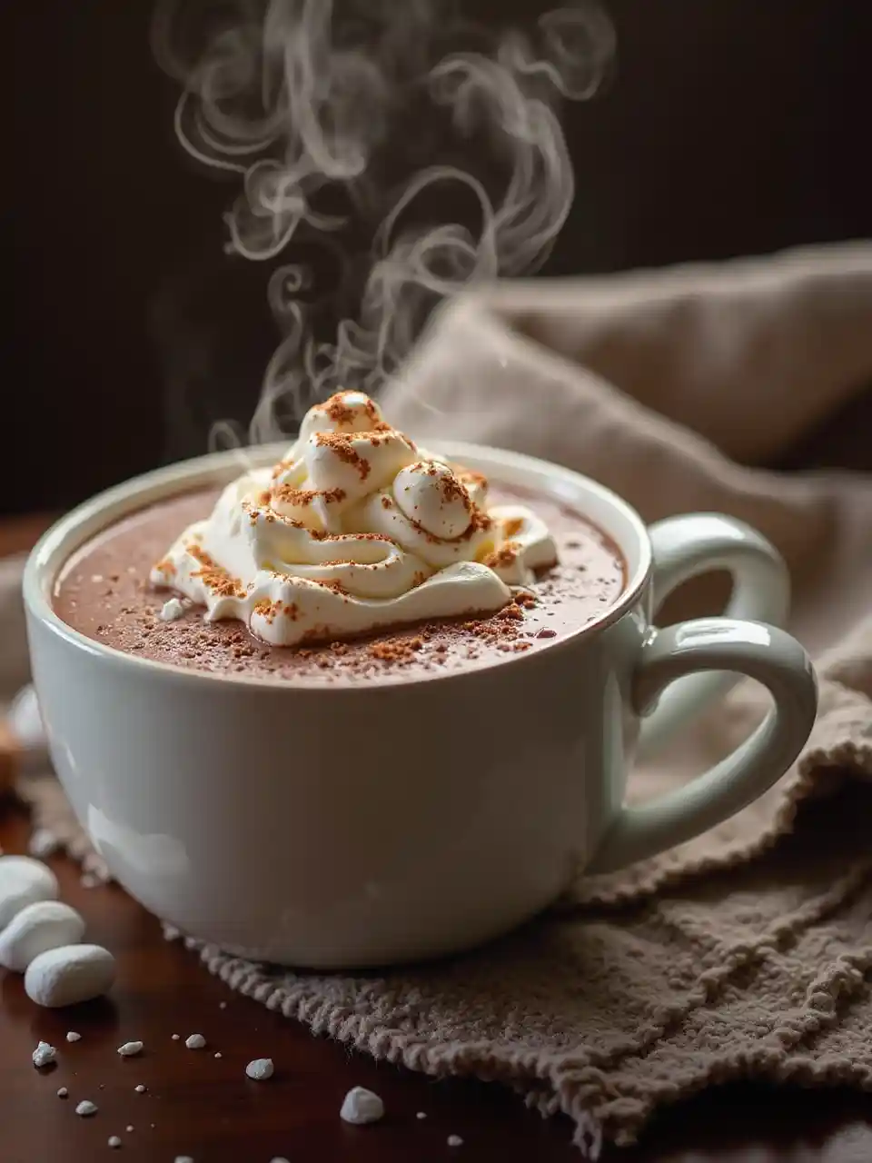In een stoomende beker wacht een rijke warme chocolade met golvende room en pluizige marshmallows. De fluweelachtige cacao glinstert uitnodigend, de geur omhult de zintuigen met warmte en comfort. De foto laat de luxe traktatie in levendige details zien, waarbij elk element uitstraling geeft van genot en decadentie. De room draait als wolken en de marshmallows glinsterden als miniatuur met sneeuw bedekte bergen, het creëren van een visueel feest dat zowel troostend als uitstekend is