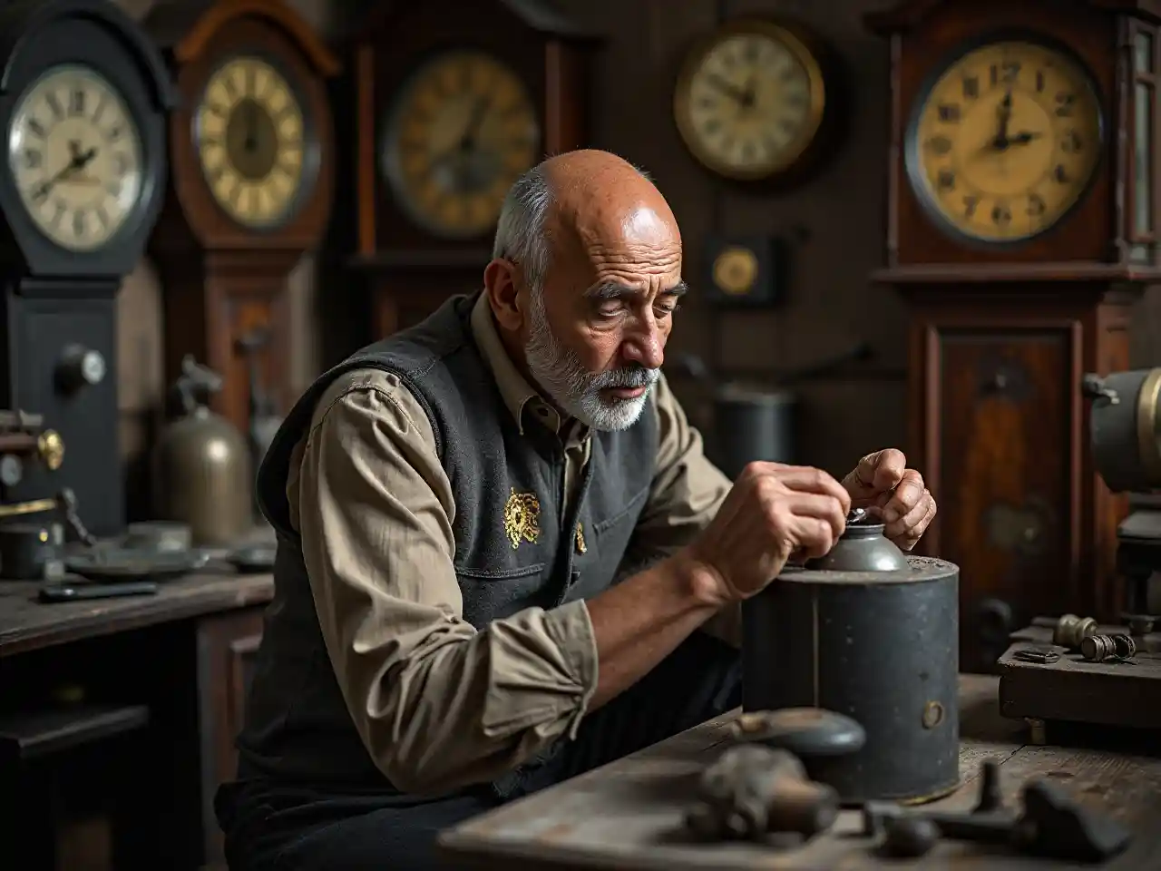 Een 78-jarige zwarte man met een kaal hoofd die een vest met een uitrusting heeft geborduurd, is een klok aan het repareren in een middeleeuws winkel. Tickende klokken en stoffige boeken omringen hem, zijn zorgvuldige tweaks stralen precisie en historische charme uit in een gezellige, rustieke scène. Hij is onwrikbaar.