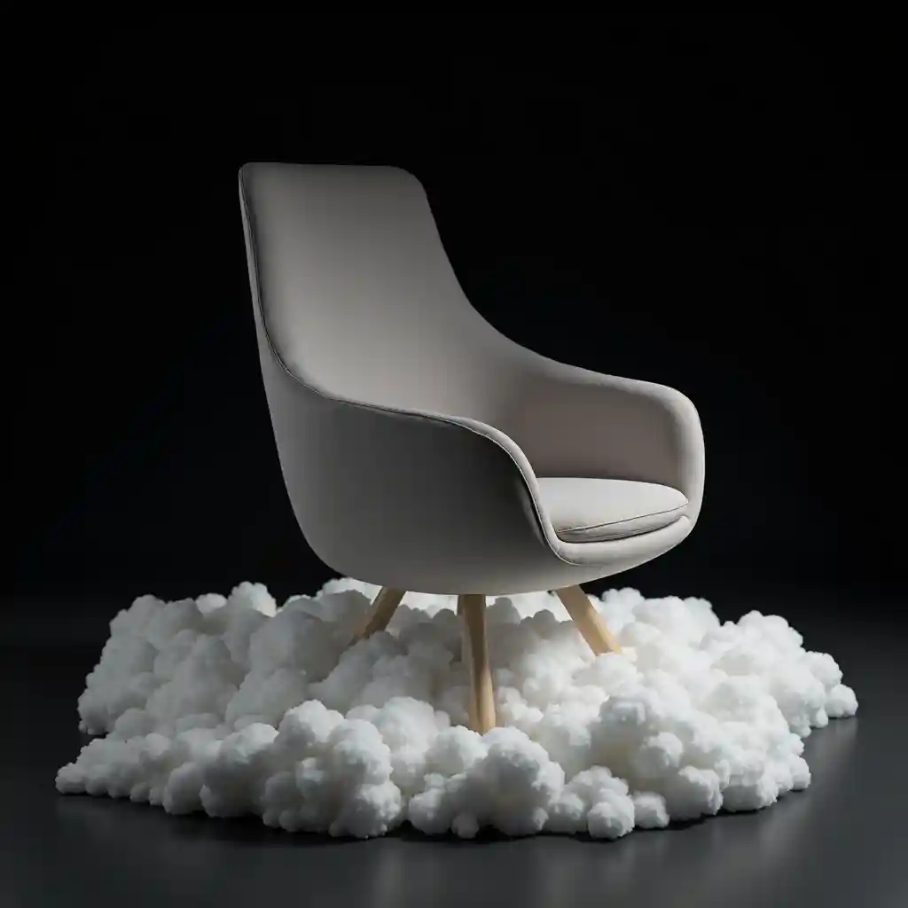 PianeerEen prachtige moderne stoel in de vorm van een witte wolk, studio foto, zwarte achtergrond, studio licht, hyper realistisch, hyper gedetailleerd