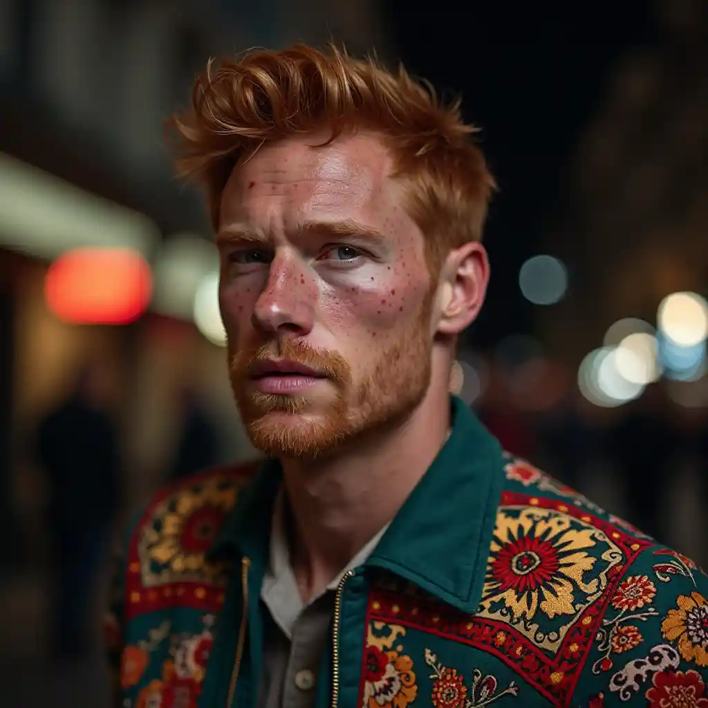JaydenEen mooie rode man met sproeten, met een kleurrijke, levendige, gedetailleerde geborduurde jas, medium full shot, ' s Nachts