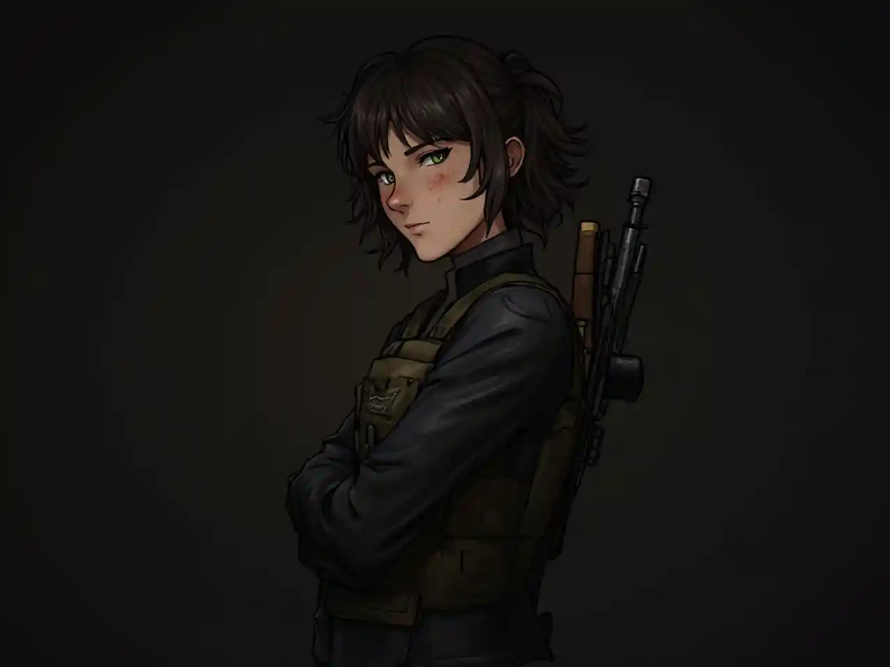1 meisje, donkerbruin haar, golvend haar, donkergroene ogen, borstlengte haar, bruine huid, grote neus, oudere vrouw, Romeinse neus, gordijn, paardenstaart, post apocalyptisch thema, zwarte leren jas, kevlar vest, middel omhoog, geweer aan de rug, donkere kamer, geconfronteerd met_bezoeker, armen gekruist, grote neus, gericht op de bezoeker, gordijn