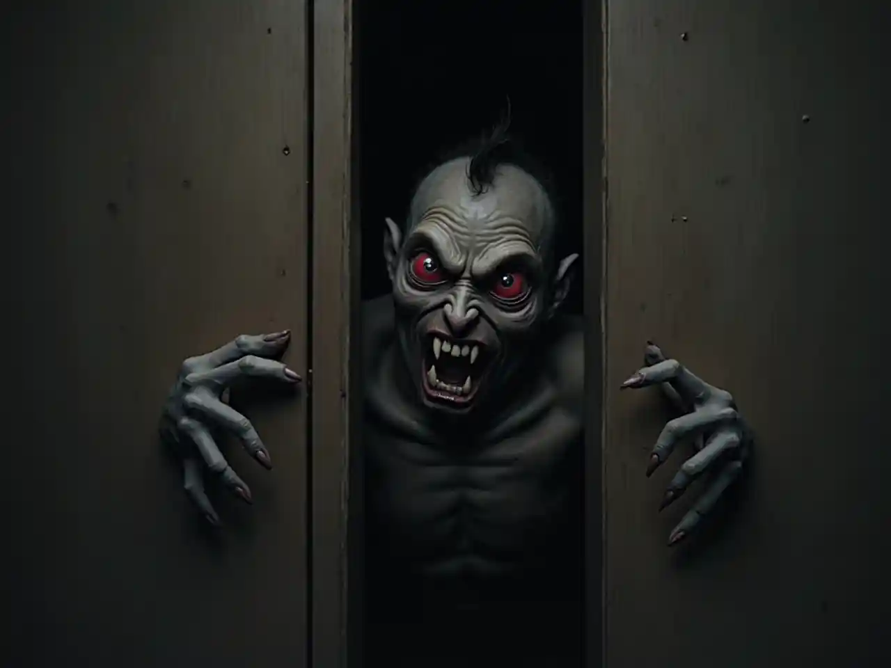 Een griezelig wezen met rode ogen en scherpe tanden kijkt uit een donkere kast, met klauwen.
