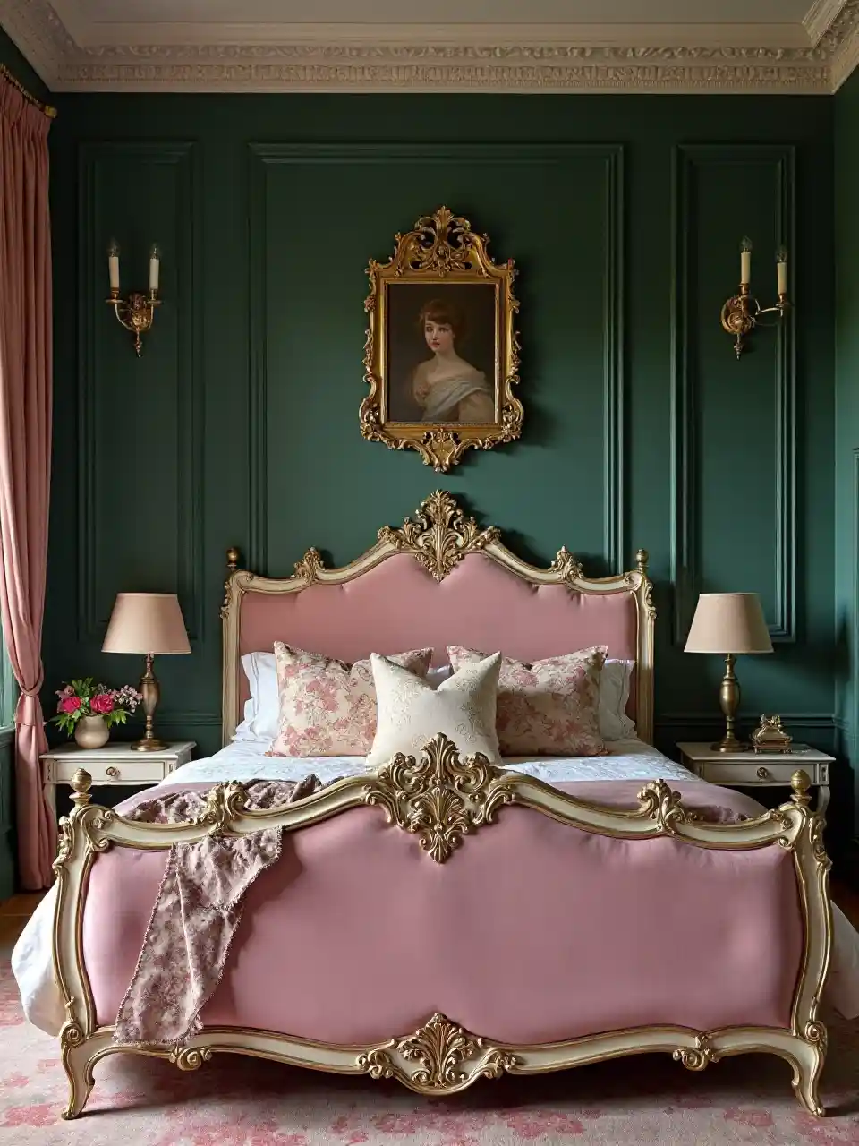 Een gedetailleerde (maximalistische slaapkamer)) met een (donkergroene muur)) versierde gips en een roze fluweel Roco bed), geaccentueerd door ingewikkelde zijde kussens en weelderige gouden armaturen