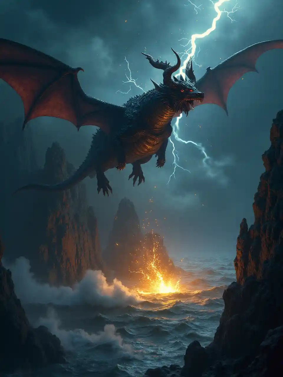 Maak een realistische donkere terreurfoto van een vliegende spookkaravel. De nachtelijke hemel heeft donkere nevels vol met sterren en bliksem. Majestueuze zwarte spierharige horing Satans vliegen met vleermuis vleugels. De onstuimige oceaan is open gebroken en een laser diamant zit op een gesmolten goud meer. Op de achtergrond ontploft een atoombom. Het regent meteorieten en goudklontjes met vlammende staart. Het regent met zwarte inkt. Zhangjiajie-achtige/Wulingyuan-achtige donkerblauwe torens bestaan aan één kant. Aan de andere kant een majestueuze boze draak met een maximale boze gezicht, as ogen en vlamwer mond. Maak het als een realistische donkere terreur foto.