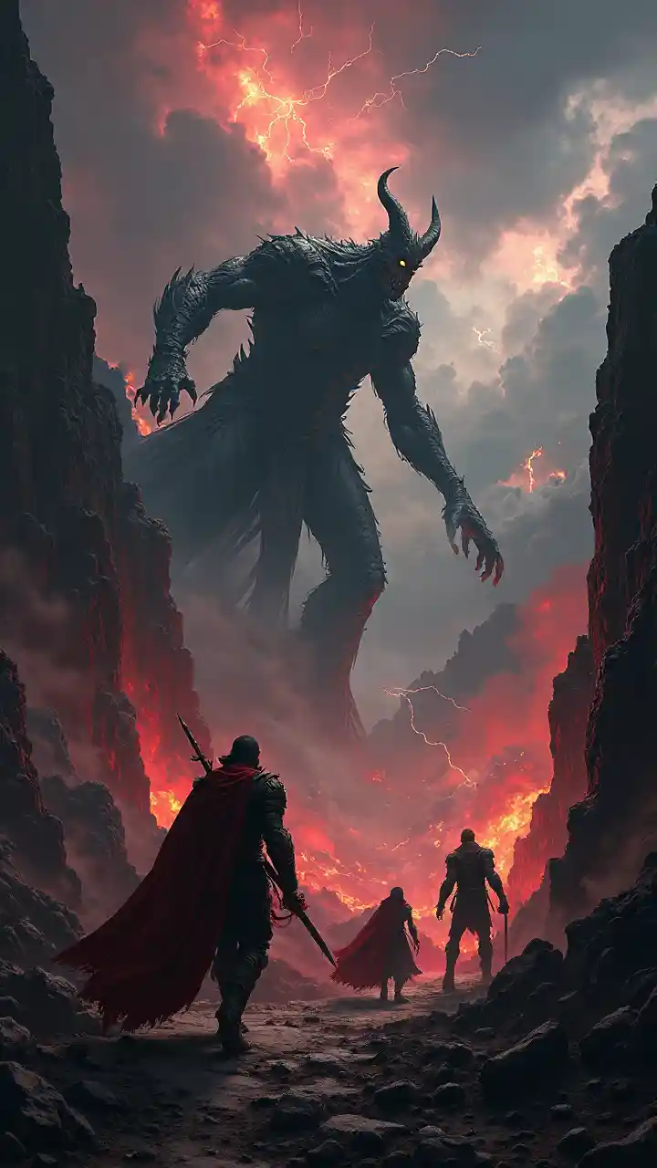 In een chaotische wereld, doordrenkt met tinten van donker rood en inkt zwart, schittert de lucht van onrustige energie terwijl demonen en mensen zich voorbereiden op een epische confrontatie. Hooggebouwde rotswanden schitteren over een slagveld met gebroken aarde en gepijnde overblijfselen van de beschaving. De lucht knalt van stormen, bliksems snijden door onheilspellende wolken, verlichten de felle gezichten van mensen gekleed in verscheurde harnassen, hun ogen vol uitdaging en wanhoop. Tegenover hen laten torenhoge demonen met verwrongen vormen en gloeiende ogen een guturaal gebrul los, hun huid glinst met een dreigende glans, terwijl zij groteske wapens hanteren die met duistere energie lijken te pulseren. De sfeer is vol spanning, een tastbare angst die op de rand van de wanhoop schommelt. Deze dynamische scène kon worden gerealiseerd in een donkere fantasieconceptkunst, die de rauwe emotie en chaotische schoonheid van de ontvouwende epische strijd vastlegt.