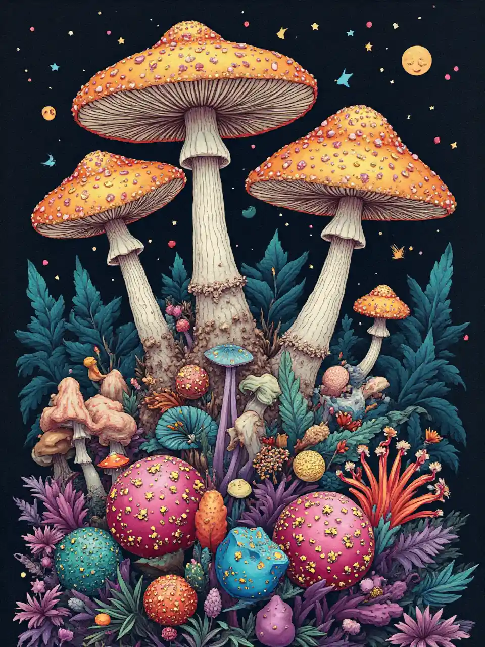tekst van de woorden "DEREK" "&" "MERRY" verwerkt tot een retro-psychedelische collage van psychedelische paddenstoelen met een retro-afwerking (Psilocybe cubensis, Psilocybe semilanceata, Psilocybe cyanescens, Psilocybe azurescens, Psilocybe tampanensis, Psilocybe mexicana, Psilocybe caerulescens, Psilocybe baeocystis, Psilocybe stuntzii, Psilocybe ovoideocystidiata, Panaeolus cyanescens, Panaeolus tropicalis, Gymnopilus junonius, Gymnopilus luteolius, Gymnopilus aeruginosus, Copia bis, Inocybe aeruginasc, Plutius salicinus, cyanopil, spectrum, optische, geologische, geologische, geologische, geologische, geologische, geologische, geologische, geologische, geologische, geologische, geolog