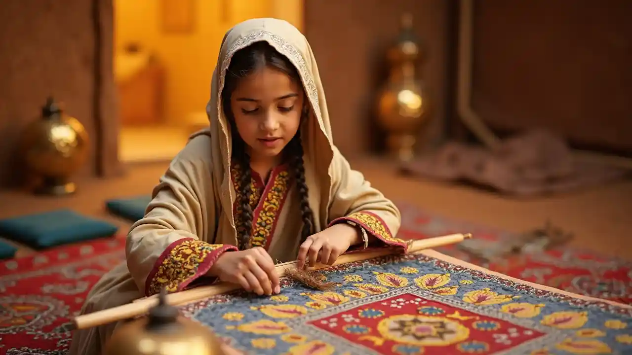 Een negenjarig meisje uit het Midden-Oosten weefde een tapijt in een woestijntent. Gouden lantaarns en gemodelleerde tapijten omringen haar, haar wendbare vingers stralen vaardigheid en culturele trots uit in een warm, exotisch milieu.