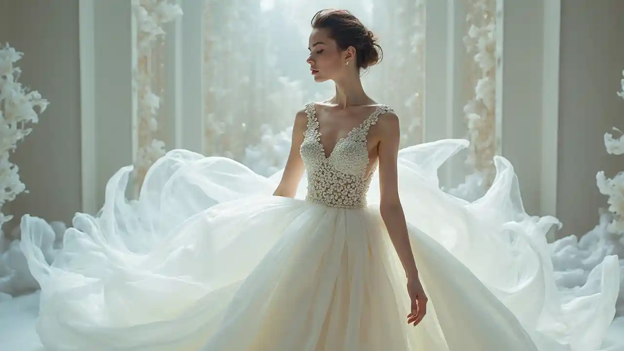 AidenFoto van onder van een modemodel, luxe jurk geïnspireerd door melk vloeistof, officiële Dior redactie, zeer gedetailleerd