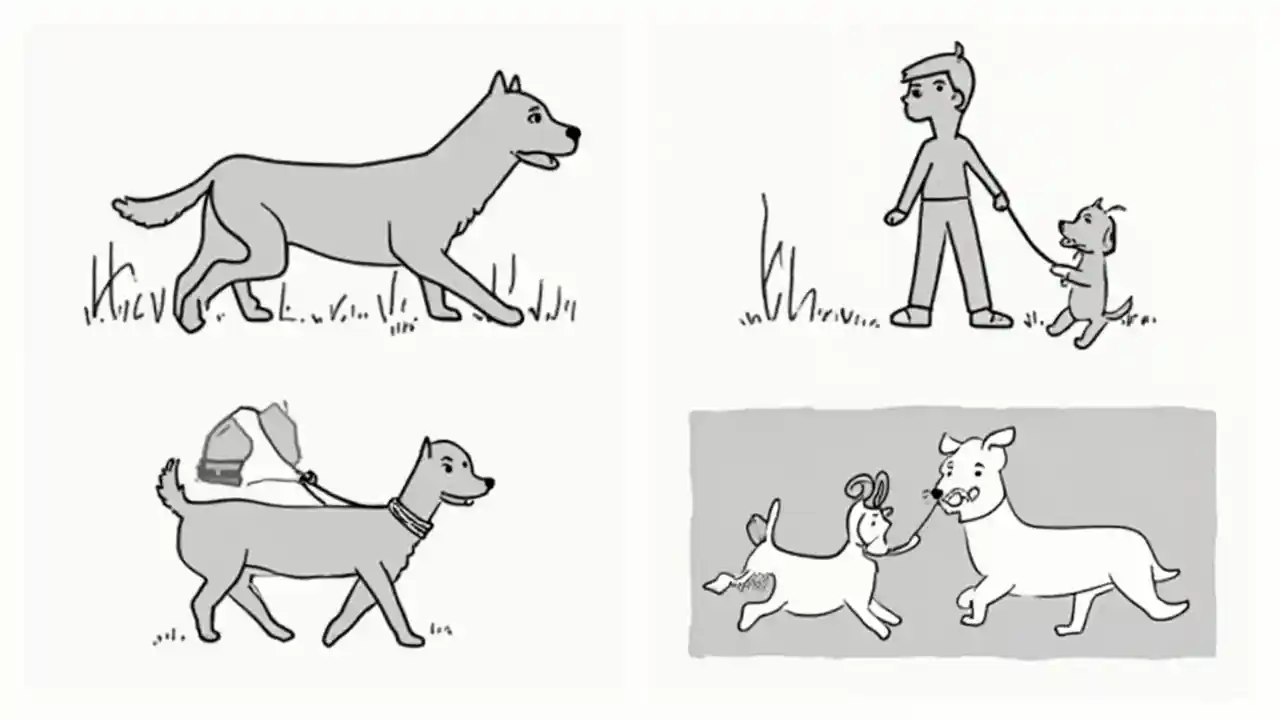 JacobVier zwart-wit logo's met een persoon die een hond loopt.