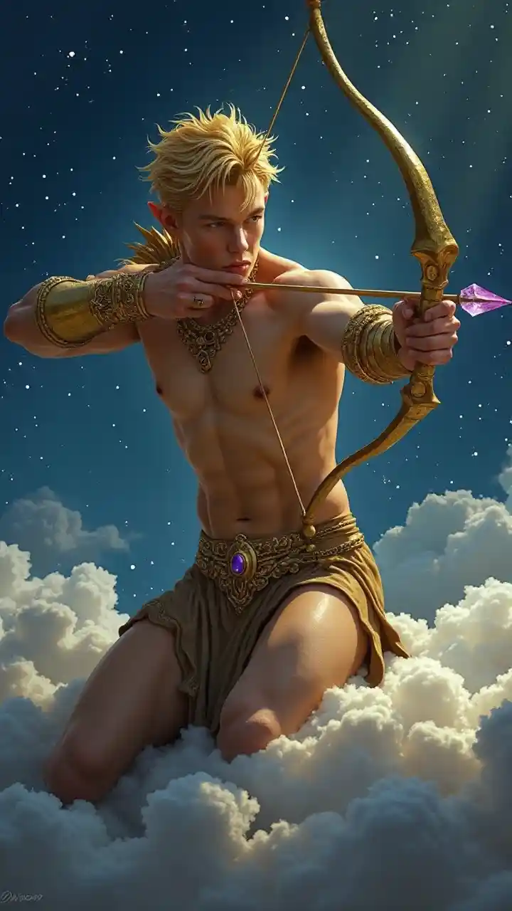 Sidhe Elf in the Dream Realm. He kneels upon a cloud, his bow is drawn and and aimed. The bow is gold, the arrow has a sharp crystal tip, light shining from the arrowhead. His gaze is intense as he aims for his target, his brow furrowed. He is shirtless, his muscles tight and body glistening with sweat and glitter. The hair under his arms thick and visible. He wears reflective metallic gold paulfrons upon his muscled shoulders. A gold chain with an amethyst crystal pendant around his neck. His golden blond hair is shaved short in the back and sides {{{short hair}}}, longer on top and spiky, which makes his elven ears more obvious, a golden metallic headband with an amethyst jewel at the center around his head. His eyes are like opals, bright and intense, changing with his moods. His face is handsome, masculine, hairless, aside from his thick manly brows. Strong brow and jaw, cleft chin. He wears metallic gold bracers on his strong arms, and metallic gold boots. His legs are bare, roped with muscle. His groin barely covered by a metallic gold loincloth, the middle part draped over his massive genitals. Wide shouldered, narrow waist, sinewy, well defined, light blonde hair on chest, narrow trail of hair on abs. Full body pose, the stars shining down upon him... (((Short hair!)))