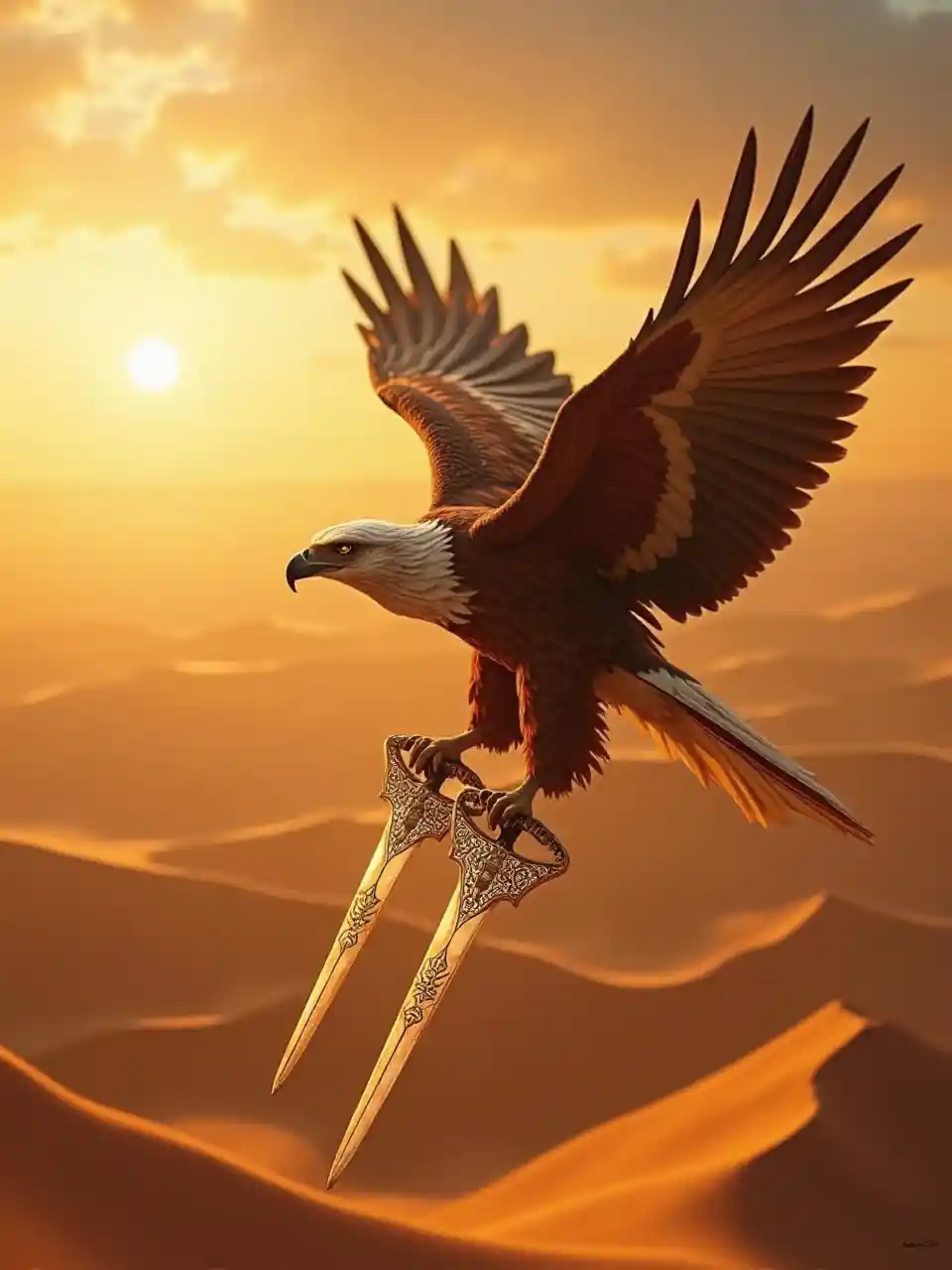 Stel je een majestueuze garuda-adool voor die hoog boven een uitgestrekte Arabische woestijn zweef, met zijn krachtige vleugels tegen een achtergrond van eindeloze gouden duinen over Riyad. De zon hangt laag aan de hemel en werpt een warme, berengte gloed uit die het landschap in rijke oranje- en gouden tinten bad. Opvallend is dat de adelaar een paar sierlijk ontworpen zwaarden van Saoedi-Arabië vasthoudt, waarvan de handgrepen in het zonlicht glinsteren, en die een ingewikkelde kalligrafie en patronen weerspiegelen die kracht en moed symboliseren. De scène laat een moment zien van pure vrijheid en kracht, terwijl de agelachtige ogen de horizon doorzoeken, zijn veren door de wind worden geramd. De sfeer combineert de grootsheid van de natuur met een vleugje oude traditie, wat een gevoel van adel en avontuur oproept. Dit beeld zou prachtig worden weergegeven in filmische verlichting, fotorealistische stijl om de textuur van de vogelveren en de glinsterende zwaarden te benaderen. In hoge definitie