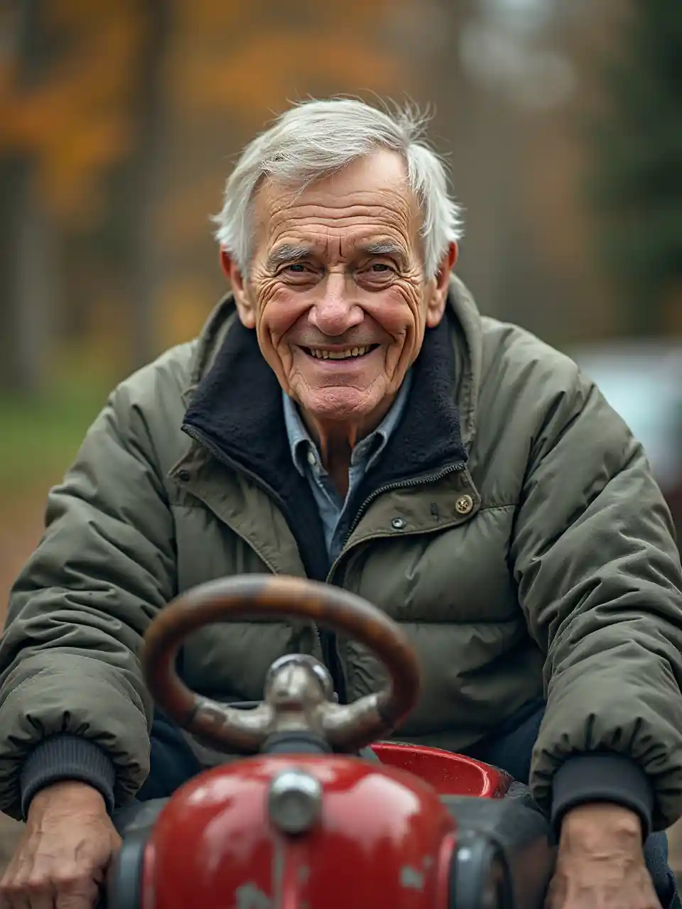 Glimlachende oudere man met een rimpelend gezicht, zit op een grote speelgoed auto, wazig achtergrond, levendige verzadigde kleuren, contrast kleur