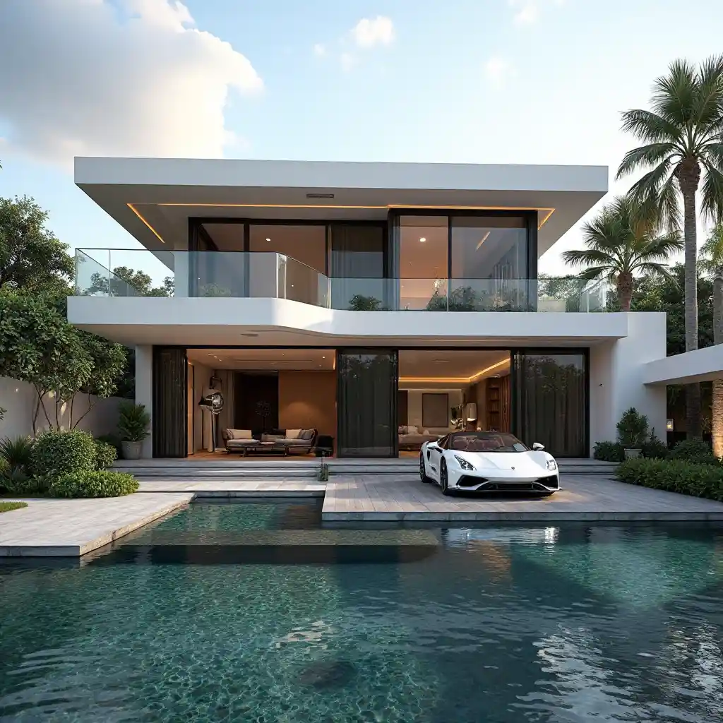 EleanorEen elegante moderne 100 miljoen dollar huizen met water, hoge plafonds en unieke chique eigenschappen van buiten met chique auto's buiten
