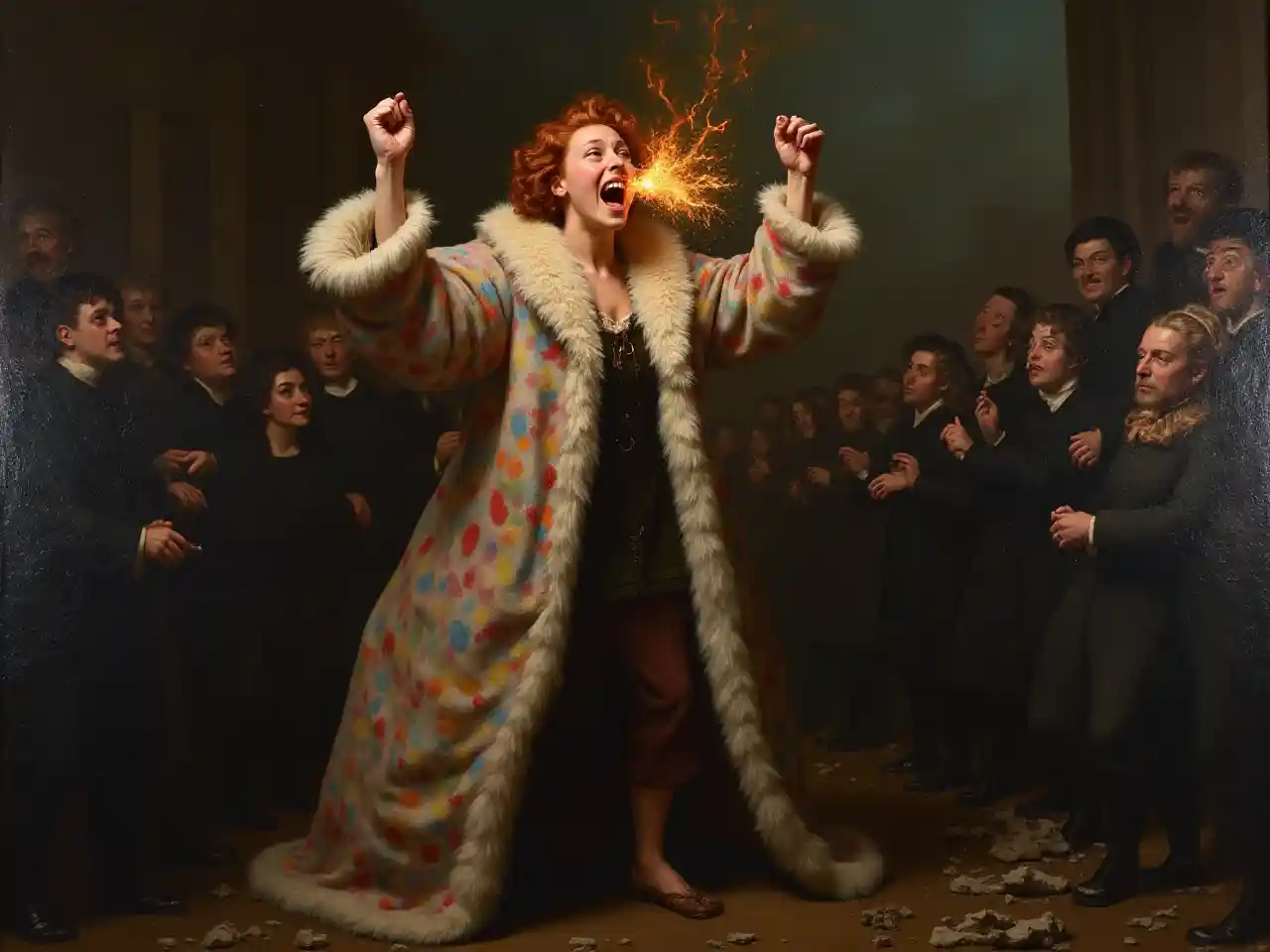 Olie schilderij, Rembrandt, Dramatisch roodharig vrouw gemachtigd (zijkijk) met een lange pluizige kleurige jas, de vrouw schreeuwt vol, vlammen komen uit haar mond, beide vuisten gesloten, sprankelend hoog in de lucht. De vrouw is omringd door mensen in zwart en wit, bleek. Donkere puin en verwoesting als achtergrond in de Nederlandse Gouden Eeuw