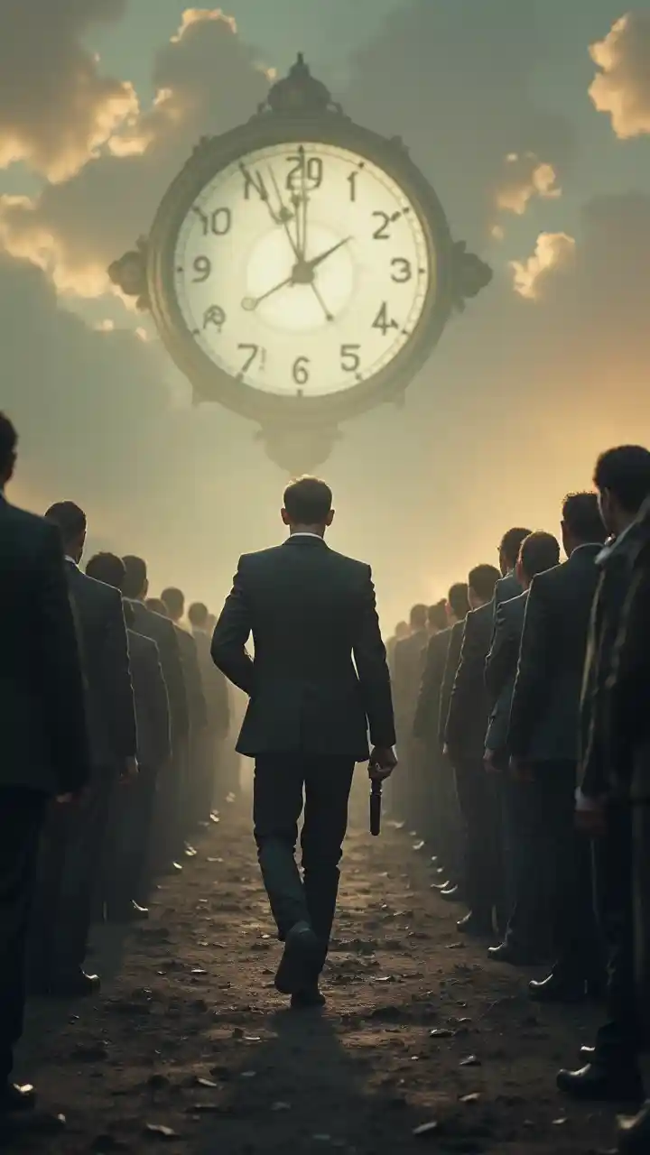 Een zwarte man met een wapen die onbevreesd een straat afloopt met mensen die naar hem kijken met afgunst en. Vermengd in de achtergrond is een enorme zwakke dreigende klok, als de aartsvijand van de mens