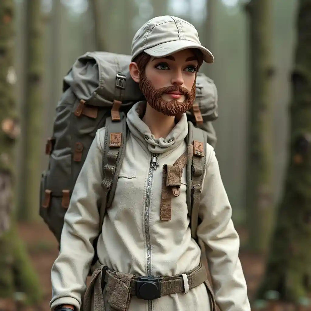 LunaEen moderne vrouwelijke jager met een korte baard, witte kleren en een rugzak