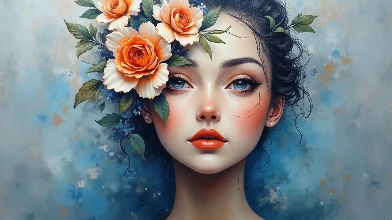 Canvas, vrouwelijk gezicht met een bloem op haar voorhoofd, canvas, abstract, achtergrond, zilver grijs en blauw,