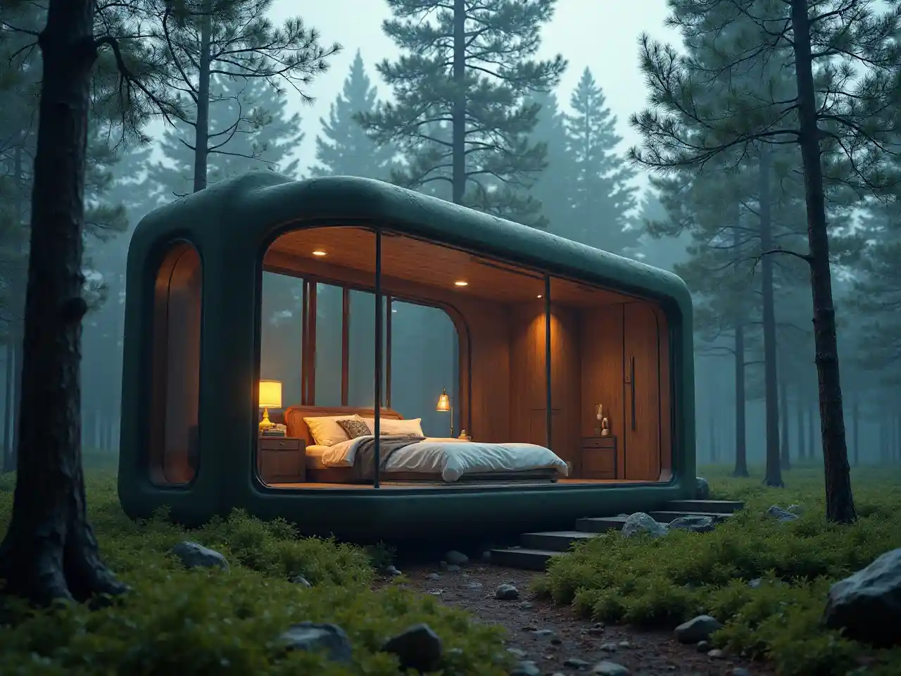 TinaEen foto van een futuristische module met een slaapkamer, een kubushuis, diepe sfeer, in het bos, de wildernis, de wilde natuur