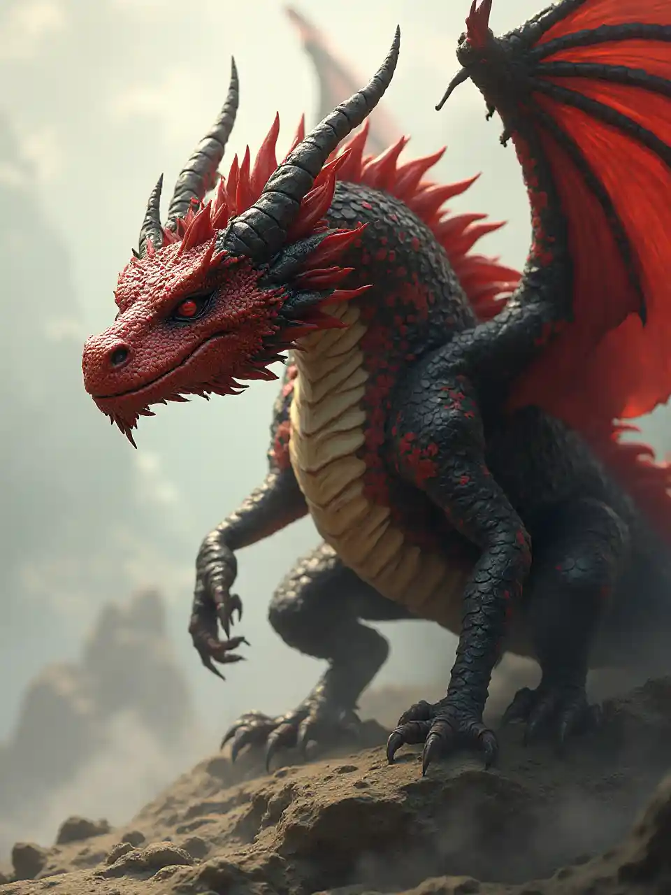 Maak een visueel van een grote, vriendelijke voor mensen, slim, ademt zwavel damp, spiked, rood en zwart, kan vliegen, en camouflage draak