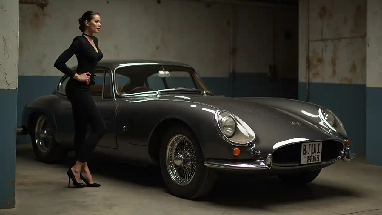 Vrouw met zwarte hoge hakken in een garage, in de stijl van gedurfde bochten, bont affiniteit, natte kern, figuren serpentinite, gestroomde vormen, trein kern, Fernand khnopff