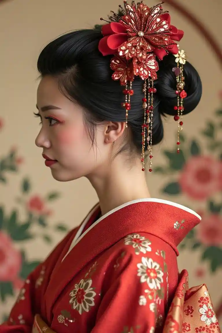 stxph"Een Japanse vrouw met een normale huidskleur, een glanzende paardenstaart met een grote sprankelende vlindershoofdstuk * * Draag een rode kimono met een prachtige