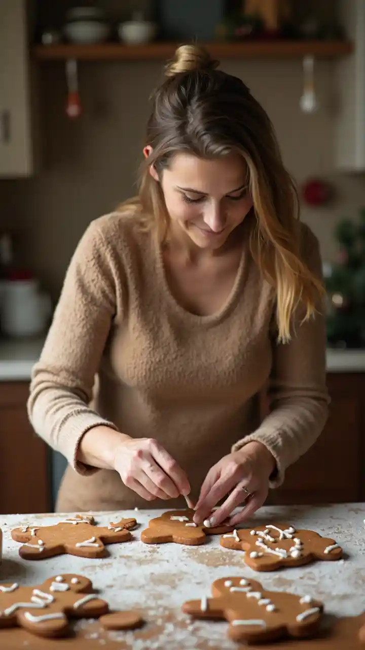 Een boeiende kerstscène met een vrouw die peperkoekjes bakt