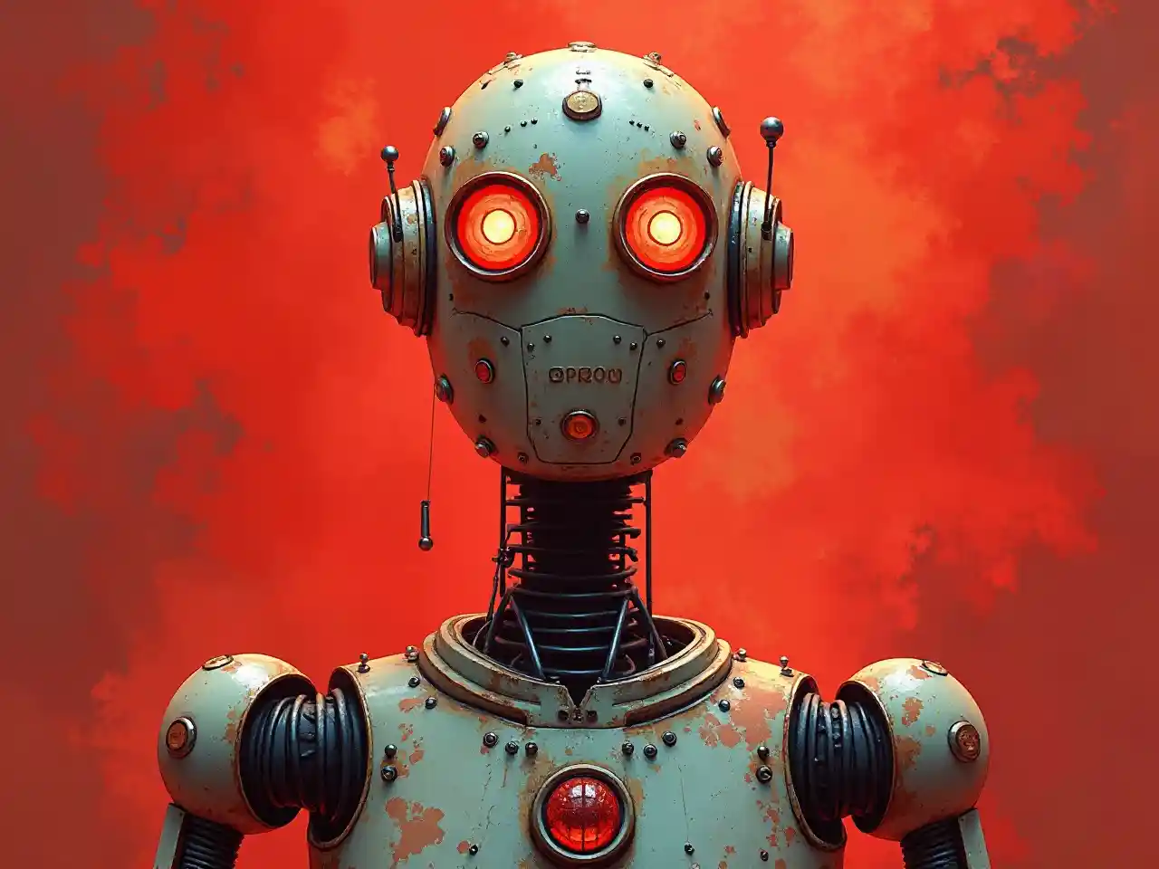 robot science fiction jaren 1970, gemaakt van glas, frontview, rode achtergrond, impressionistische stijl, digitale kunst