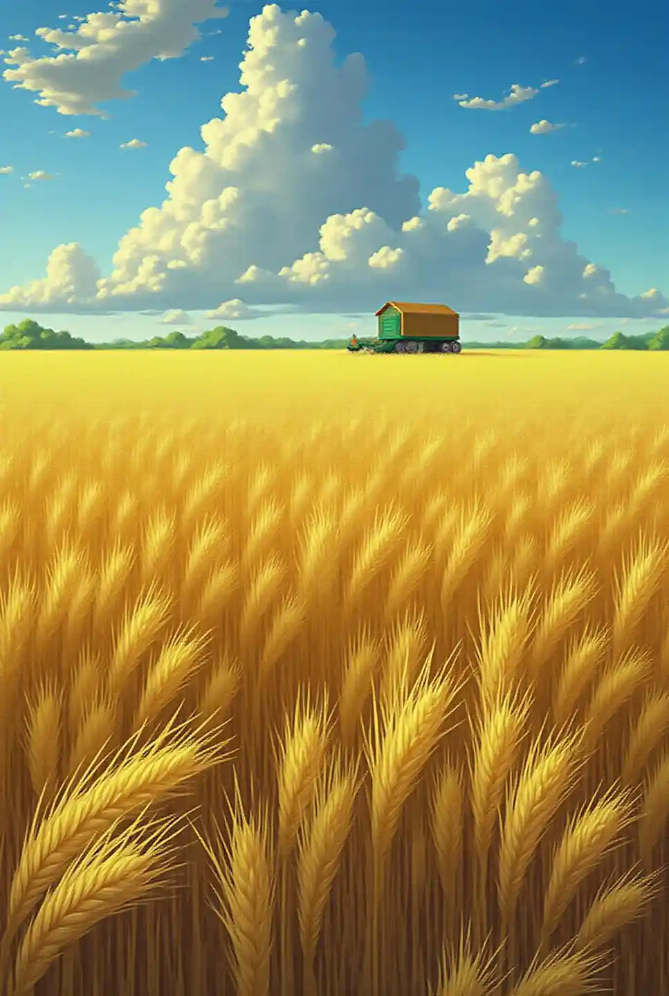 GraceSuper Realism, The land where golden wheat spreads, cobalt blue sky over the horizon, No clouds