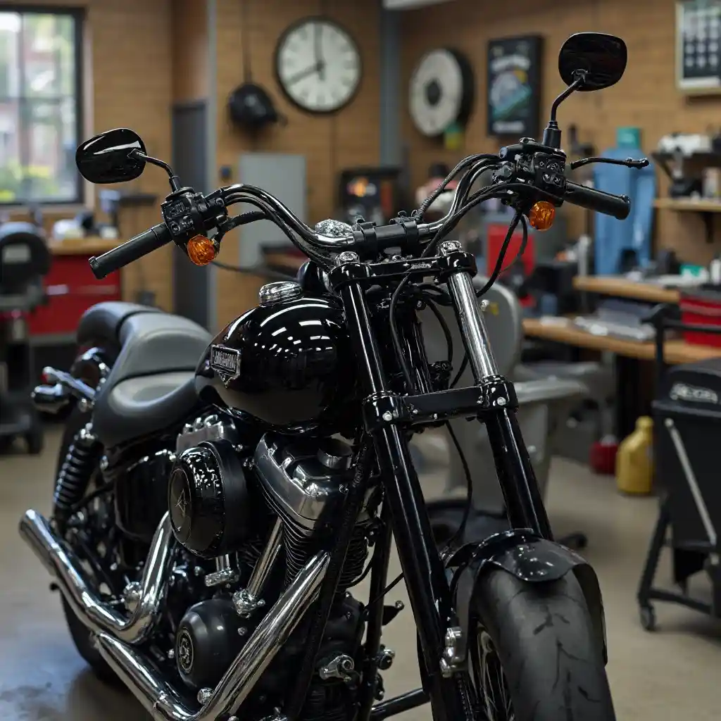 Zwarte chroom Harley-Davidson Softail Breakout vlak stuur in een garage, moet zichtbaar zijn de motor is in een garage, mechanische gereedschappen, schoon beeld, ongelooflijke graphics, in rit 5 stijl