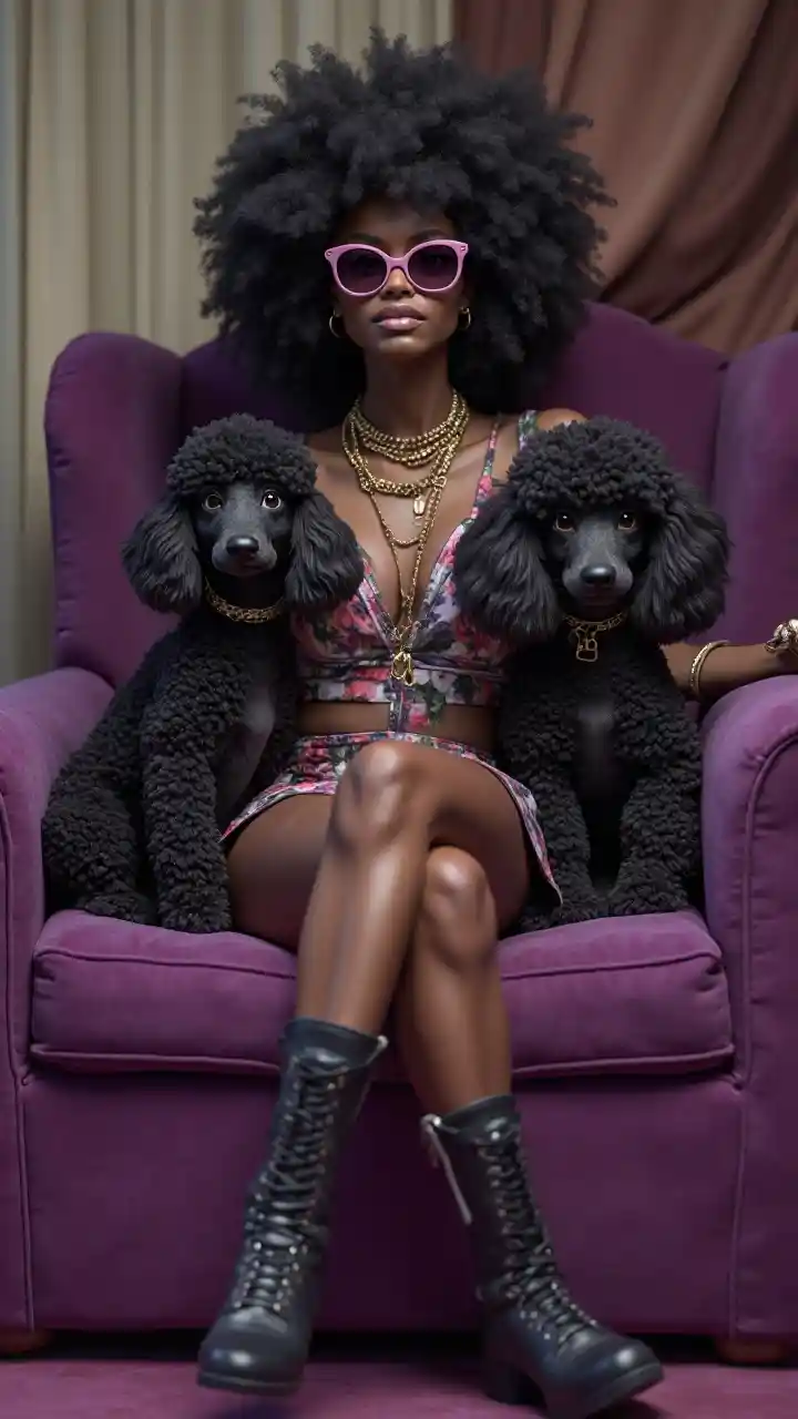 EvelynZanger Ida Corr met zwart afro en grote zonnebril zit op een paarse fauteuil met 2 poedels, 4k, super realistisch