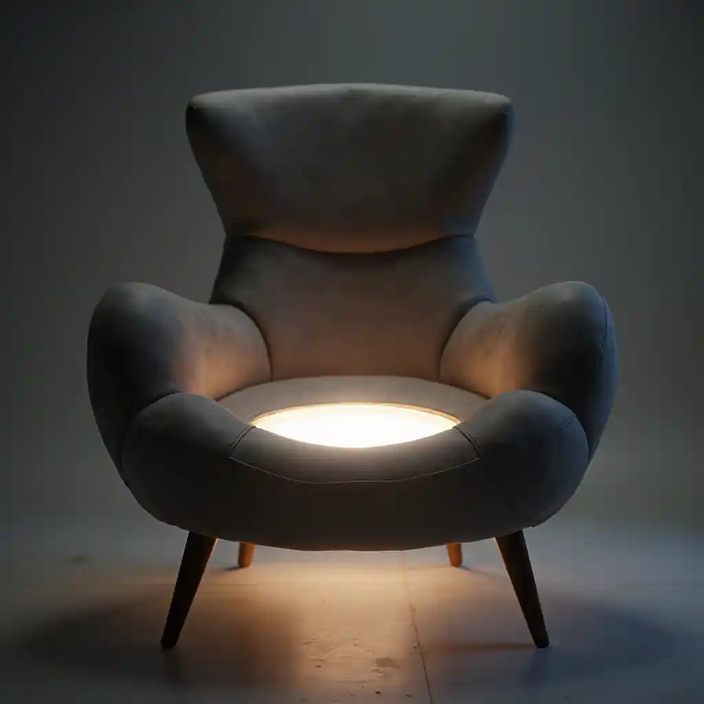 Voorbeeld van een moderne stoel die naar voren kijkt. Het heeft een open onderste achterhoek-portaal, waardoor het interieur van een verlicht gebied achter het onthult.