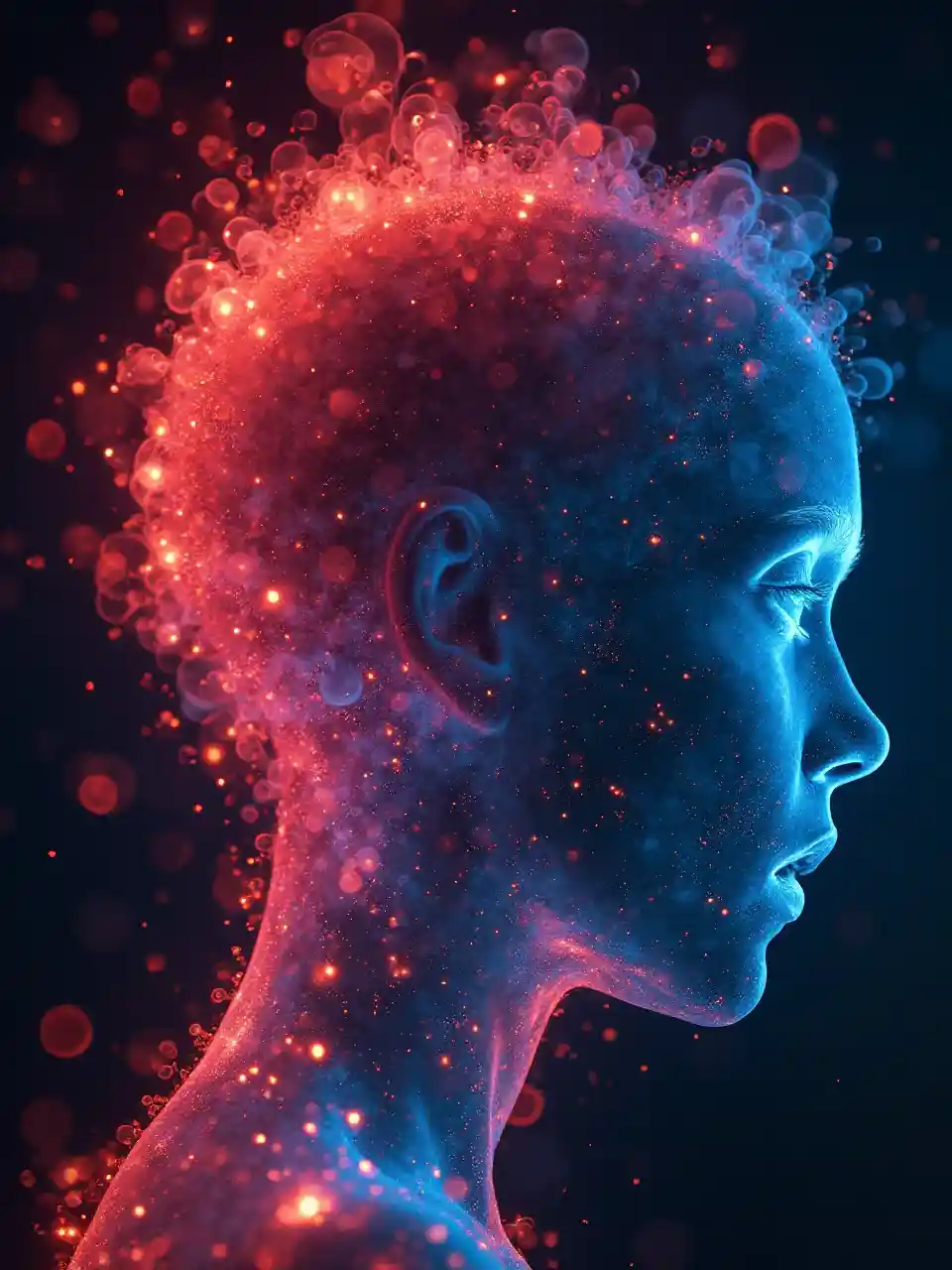 (optische illusie, hersentrick) met een fantasie land van bioluminescentie, (dubbele belichting)) spectrale contouren, chaos in al zijn vormen die in de camera schreeuwen in leven rood en blauw