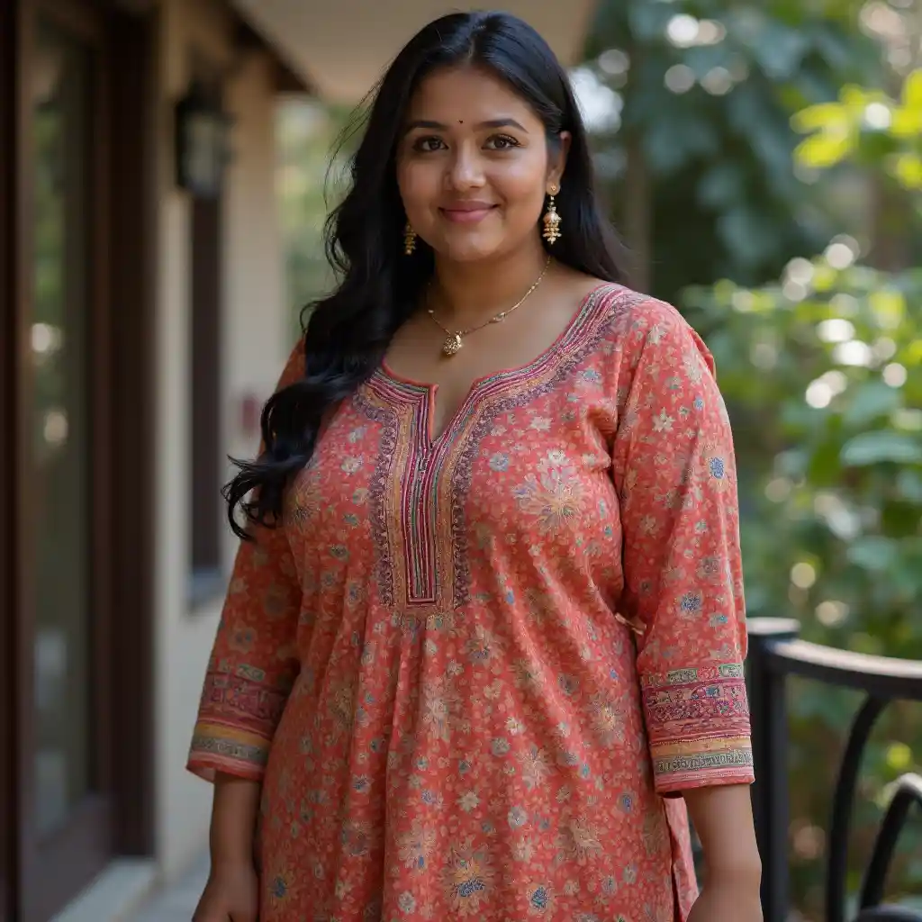Foto van een 24 jarige mooie Indiase vrouw, in korte leggings, vol, met een decolleté