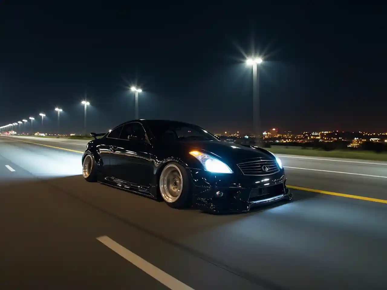 GarethIn een auto met een Infiniti G37 die's nachts op een lege snelweg rijdt