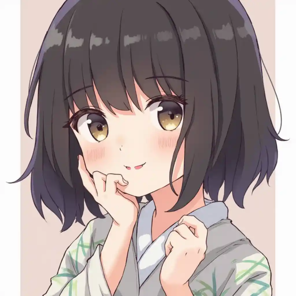 score_9, score_8_up, score_7_up, BREAK, 1girl, little girl, solo, cute, innocent, shy, blushing, black hair, short hair, bangs, silky hair, brown eyes, bangs over eyes, bob cut, eyebrows behind hair, japanese clothes, kimono, detailed clothes, looking away, thick lips, red lips,