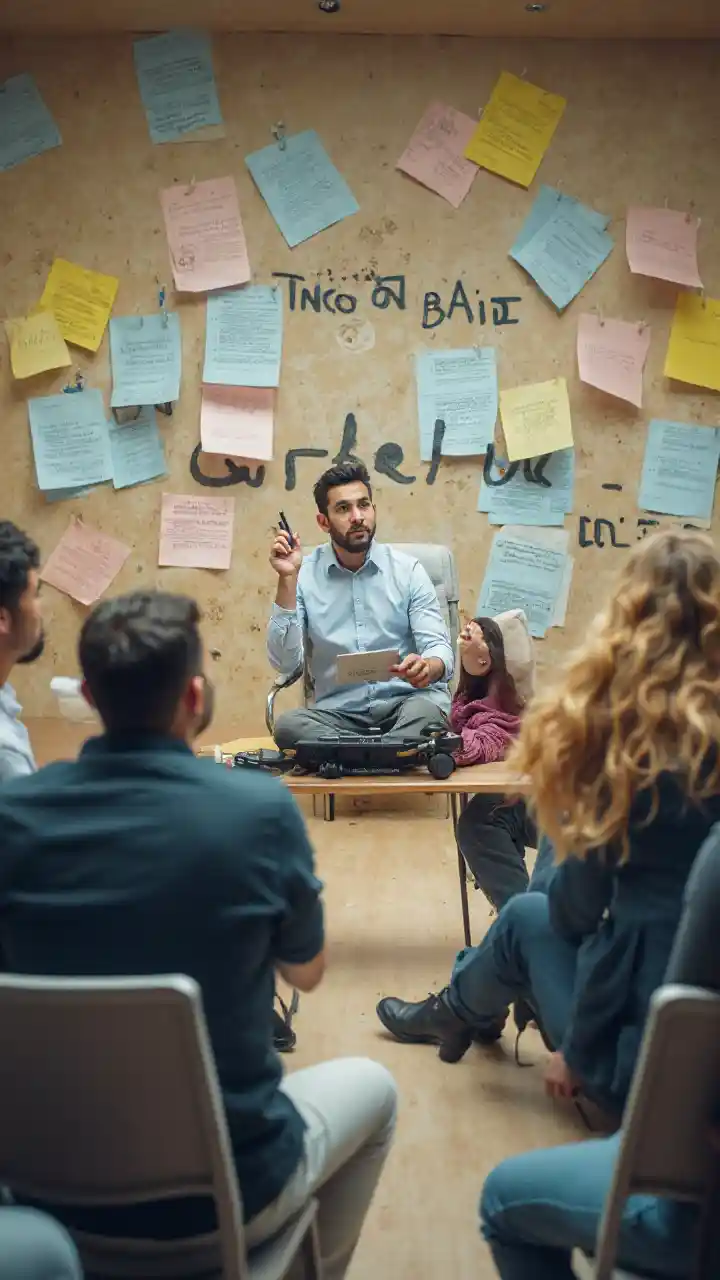 JosephEen groep zittende luisteraars met een briefje met het woord " Integrity "