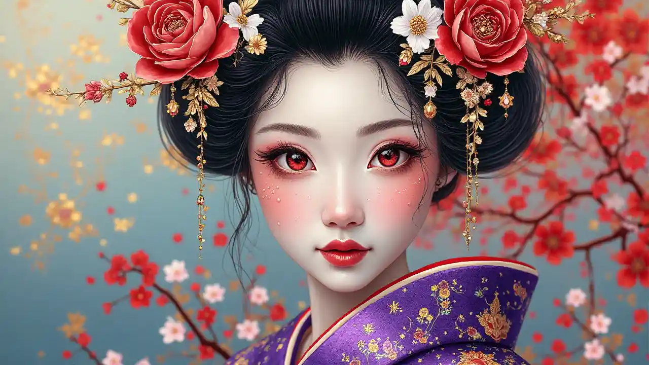 een prachtige Japanse geisha bedekt met kleine bloemen, waterdruppels, filigraan, zeer gedetailleerd, ingewikkeld versierd paarse kimono, kleurrijke fantasie, Josephine Wall, elegante gedetailleerde fantasie, digitale kunst, 32k, octane, een splinter van kleur, veelkleurig, ingewikkeld gedetailleerd vloeiend gouach schilderij, Jean Baptiste Mongue, inktstroom, kalligratie acryl Chinese inktkleurkunst, goud, hyper realistisch, olie schilder, cyberpunk, lang haar, hyper realistisch, grote mooie rode ogen, lange wimers